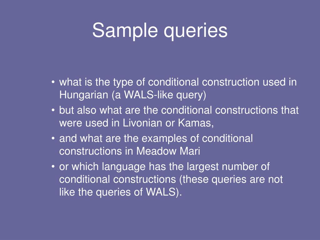 Sample queries • what is the type of conditional construction used in Hungarian (a WALS-like query) • but also what are the conditional constructions that were used in Livonian or Kamas, • and what are the examples of conditional constructions in Meadow Mari • or which language has the largest number of conditional constructions (these queries are not like the queries of WALS).