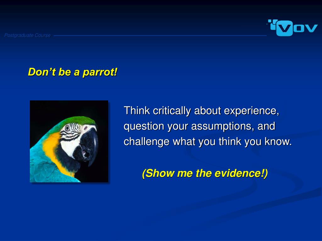 Don’t be a parrot! Think critically about experience, question your assumptions, and challenge what you think you know. (Show me the evidence!)