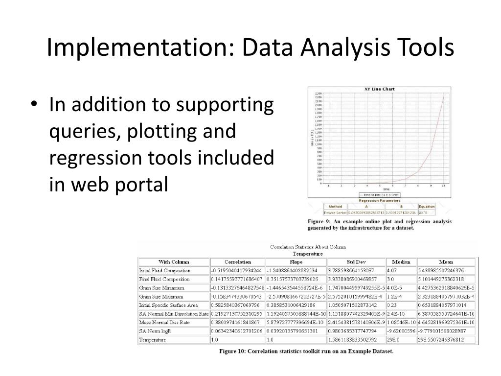 Implementation: Data Analysis Tools • In addition to supporting queries, plotting and regression tools included in web portal