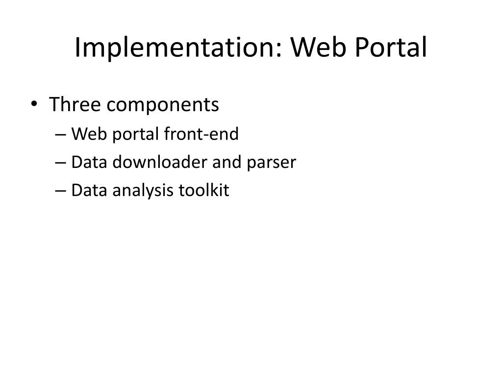 Implementation: Web Portal • Three components • Web portal front-end • Data downloader and parser • Data analysis toolkit