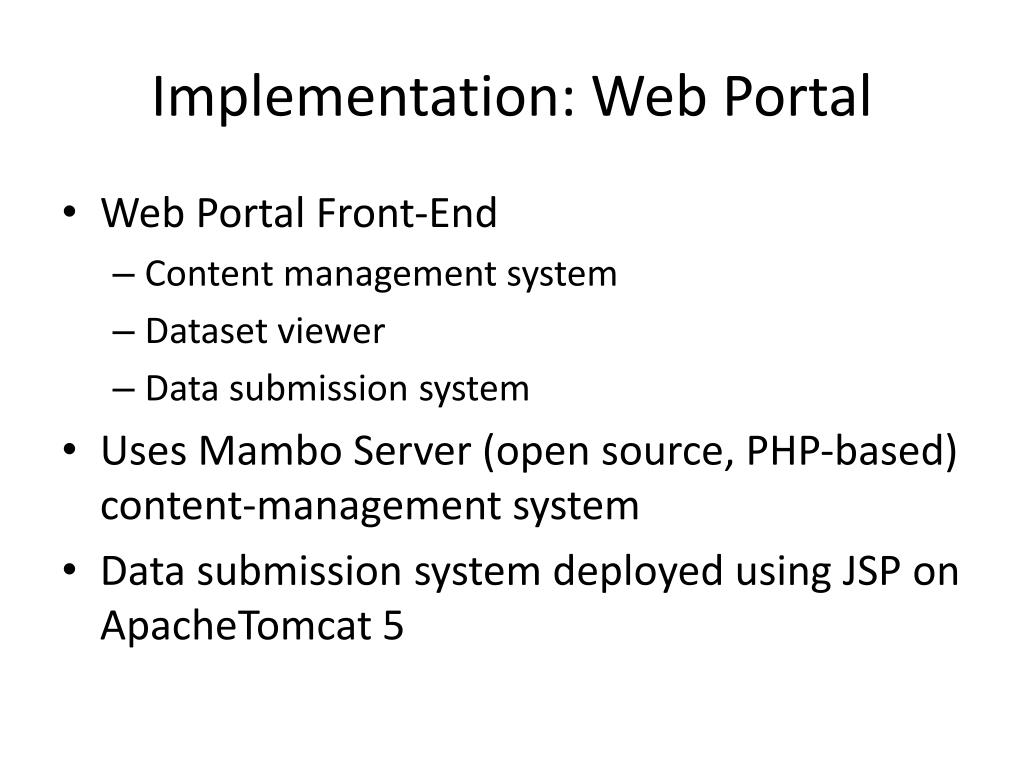 Implementation: Web Portal • Web Portal Front-End • Content management system • Dataset viewer • Data submission system • Uses Mambo Server (open source, PHP-based) content-management system • Data submission system deployed using JSP on ApacheTomcat 5