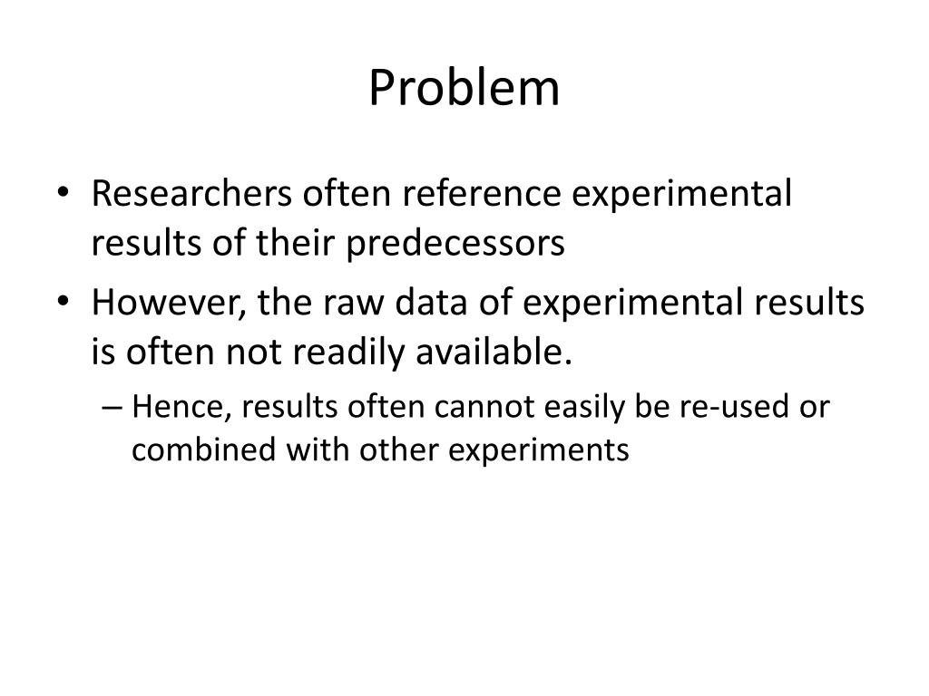 Problem • Researchers often reference experimental results of their predecessors • However, the raw data of experimental results is often not readily available. • Hence, results often cannot easily be re-used or combined with other experiments