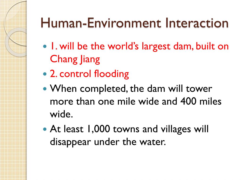 Human-Environment Interaction • 1. will be the world’s largest dam, built on Chang Jiang • 2. control flooding • When completed, the dam will tower more than one mile wide and 400 miles wide. • At least 1,000 towns and villages will disappear under the water.