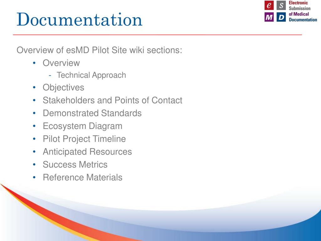Documentation • Overview of esMD Pilot Site wiki sections: • Overview • Technical Approach • Objectives • Stakeholders and Points of Contact • Demonstrated Standards • Ecosystem Diagram • Pilot Project Timeline • Anticipated Resources • Success Metrics • Reference Materials