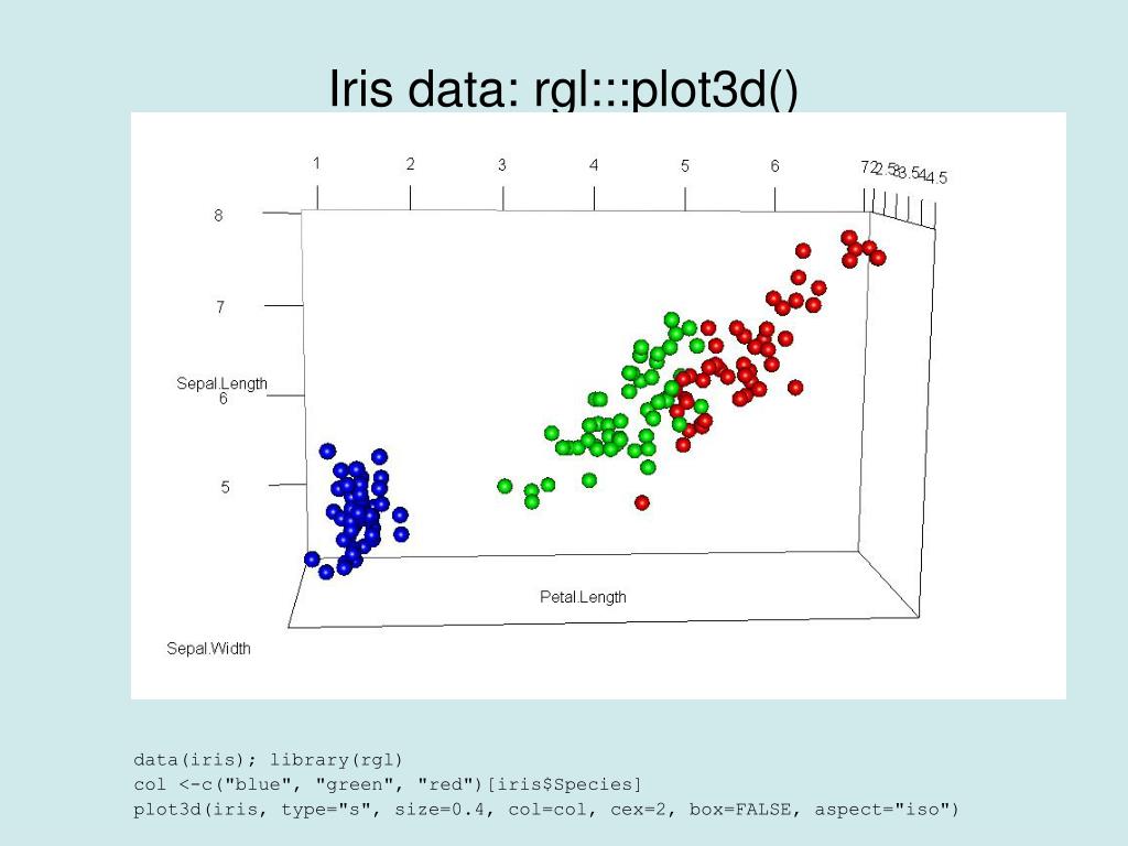 Iris data: rgl:::plot3d() data(iris); library(rgl) col <-c("blue", "green", "red")[iris$Species] plot3d(iris, type="s", size=0.4, col=col, cex=2, box=FALSE, aspect="iso")