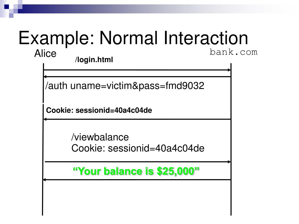 /login.html Example: Normal Interaction bank.com Alice /auth uname=victim&pass=fmd9032 Cookie: sessionid=40a4c04de /viewbalanceCookie: sessionid=40a4c04de “Your balance is $25,000”