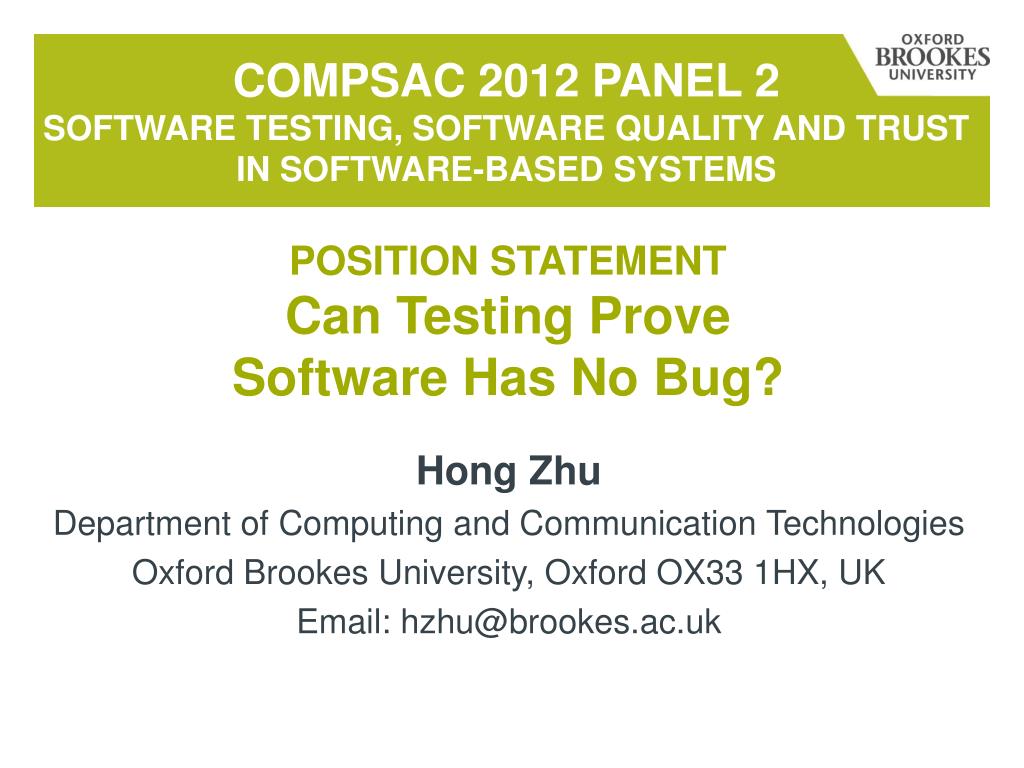 COMPSAc 2012 Panel 2 Software Testing, Software Quality and Trust in Software-Based Systems POSITION STATEMENT Can Testing Prove Software Has No Bug? Hong Zhu Department of Computing and Communication Technologies Oxford Brookes University, Oxford OX33 1HX, UK Email: hzhu@brookes.ac.uk