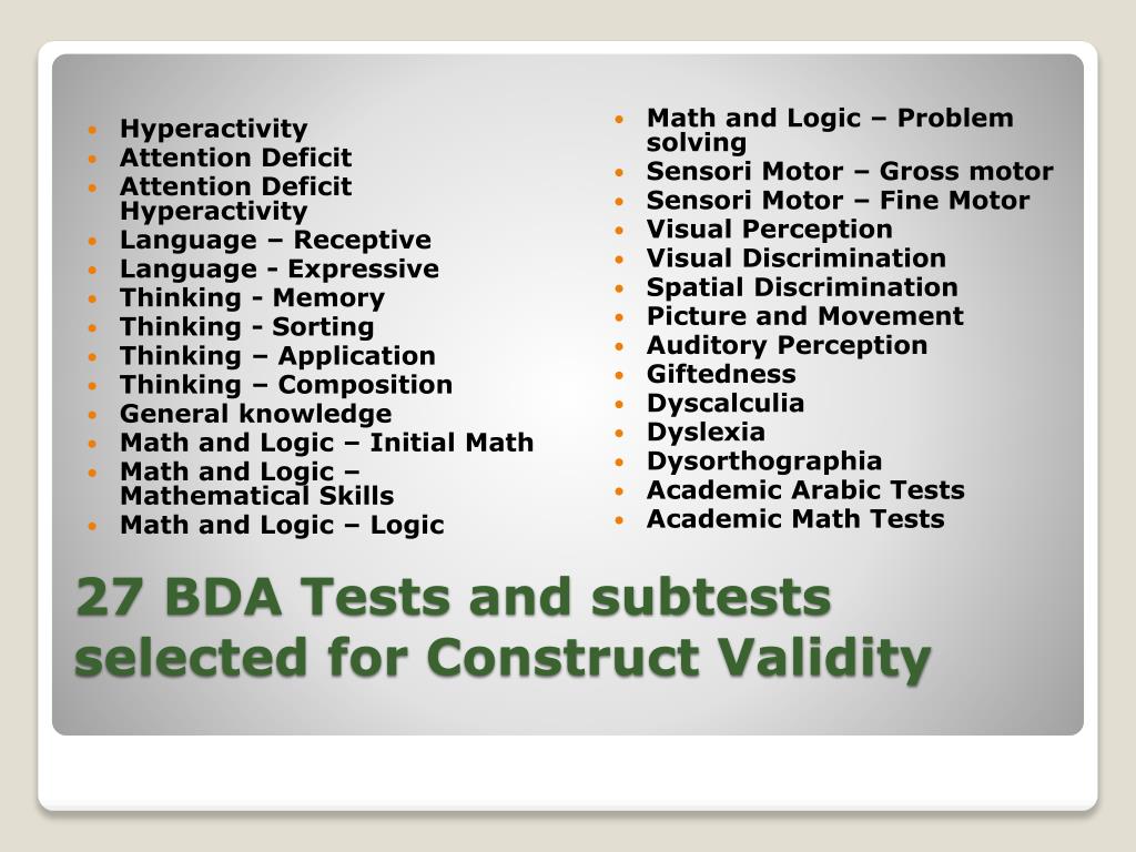 Hyperactivity • Attention Deficit • Attention Deficit Hyperactivity • Language – Receptive • Language - Expressive • Thinking - Memory • Thinking - Sorting • Thinking – Application • Thinking – Composition • General knowledge • Math and Logic – Initial Math • Math and Logic – Mathematical Skills • Math and Logic – Logic • Math and Logic – Problem solving • Sensori Motor – Gross motor • Sensori Motor – Fine Motor • Visual Perception • Visual Discrimination • Spatial Discrimination • Picture and Movement • Auditory Perception • Giftedness • Dyscalculia • Dyslexia • Dysorthographia • Academic Arabic Tests • Academic Math Tests 27 BDA Tests and subtests selected for Construct Validity