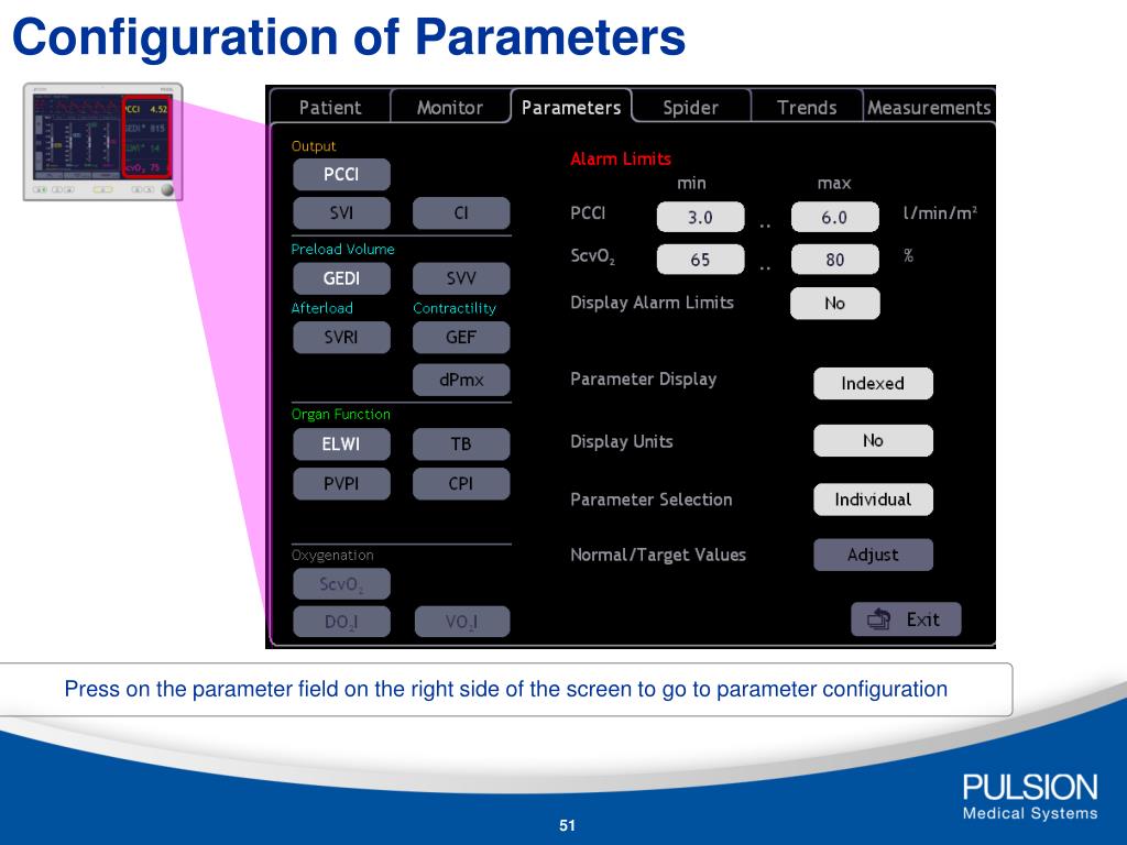 Transducer Safety Tips • Change transducer according to hospital policy (usually around every 96 hours) • PV82XX is Latex and DEHP free • Use only PULSION approved transducers for PiCCO monitoring (CE-Conformity).