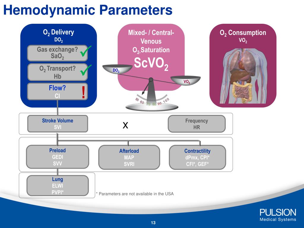 Hemodynamic Parameters O2Delivery DO2 O2 Consumption VO2 Gas exchange? SaO2 O2 Transport? Hb Flow? CI Stroke Volume SVI x Frequency HR Preload GEDI SVV Afterload MAP SVRI Contractility dPmx, CPI* CFI*, GEF* Lung ELWI PVPI* Mixed- / Central- Venous O2-Saturation ScVO2 DO2 VO2 ! * Parameters are not available in the USA