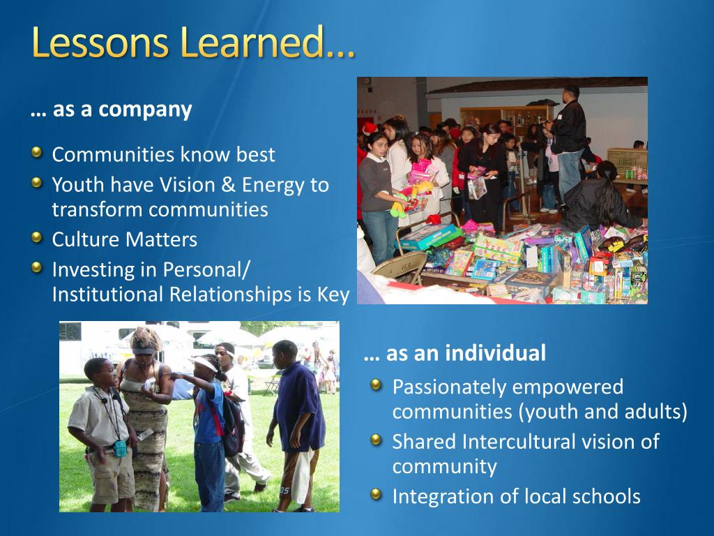 Lessons Learned… … as a company … as an individual Passionately empowered communities (youth and adults) Shared Intercultural vision of community Integration of local schools • Communities know best • Youth have Vision & Energy to transform communities • Culture Matters • Investing in Personal/ Institutional Relationships is Key