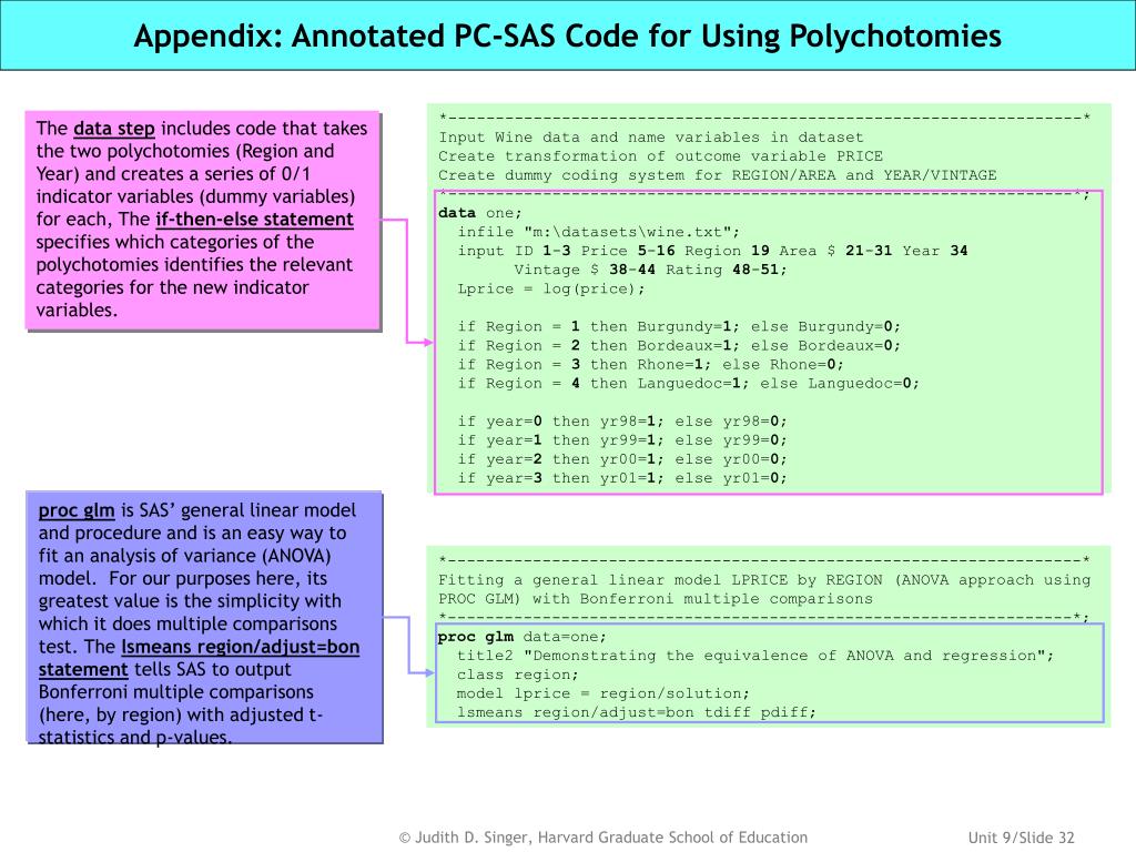 Appendix: Annotated PC-SAS Code for Using Polychotomies *-------------------------------------------------------------------* Input Wine data and name variables in dataset Create transformation of outcome variable PRICE Create dummy coding system for REGION/AREA and YEAR/VINTAGE *------------------------------------------------------------------*; data one; infile "m:\datasets\wine.txt"; input ID 1-3 Price 5-16 Region 19 Area $ 21-31 Year 34 Vintage $ 38-44 Rating 48-51; Lprice = log(price); if Region = 1 then Burgundy=1; else Burgundy=0; if Region = 2 then Bordeaux=1; else Bordeaux=0; if Region = 3 then Rhone=1; else Rhone=0; if Region = 4 then Languedoc=1; else Languedoc=0; if year=0 then yr98=1; else yr98=0; if year=1 then yr99=1; else yr99=0; if year=2 then yr00=1; else yr00=0; if year=3 then yr01=1; else yr01=0; The data stepincludes code that takes the two polychotomies (Region and Year) and creates a series of 0/1 indicator variables (dummy variables) for each, The if-then-else statement specifies which categories of the polychotomies identifies the relevant categories for the new indicator variables. proc glmis SAS’ general linear model and procedure and is an easy way to fit an analysis of variance (ANOVA) model. For our purposes here, its greatest value is the simplicity with which it does multiple comparisons test. The lsmeans region/adjust=bon statement tells SAS to output Bonferroni multiple comparisons (here, by region) with adjusted t-statistics and p-values. *-------------------------------------------------------------------* Fitting a general linear model LPRICE by REGION (ANOVA approach using PROC GLM) with Bonferroni multiple comparisons *------------------------------------------------------------------*; procglm data=one; title2 "Demonstrating the equivalence of ANOVA and regression"; class region; model lprice = region/solution; lsmeans region/adjust=bon tdiff pdiff;