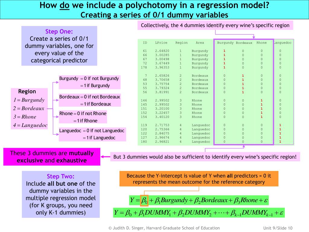How do we include a polychotomy in a regression model?Creating a series of 0/1 dummy variables Collectively, the 4 dummies identify every wine’s specific region But 3 dummies would also be sufficient to identify every wine’s specific region! Because the Y-intercept is value of Y when all predictors = 0 it represents the mean outcome for the reference category Step One: Create a series of 0/1 dummy variables, one for every value of the categorical predictor ID LPrice Region Area 61 2.64820 1 Burgundy 66 3.00285 1 Burgundy 67 3.00498 1 Burgundy 72 3.67449 1 Burgundy 178 3.96353 1 Burgundy 7 2.65826 2 Bordeaux 48 3.70658 2 Bordeaux 53 3.75754 2 Bordeaux 55 3.79324 2 Bordeaux 56 3.81991 2 Bordeaux 146 2.99502 3 Rhone 145 2.99502 3 Rhone 151 3.20100 3 Rhone 152 3.22457 3 Rhone 154 3.40120 3 Rhone 119 2.71753 4 Languedoc 120 2.75366 4 Languedoc 122 2.84075 4 Languedoc 127 2.96674 4 Languedoc 180 2.96821 4 Languedoc Burgundy 1 1 1 1 1 0 0 0 0 0 0 0 0 0 0 0 0 0 0 0 Rhone 0 0 0 0 0 0 0 0 0 0 1 1 1 1 1 0 0 0 0 0 Languedoc 0 0 0 0 0 0 0 0 0 0 0 0 0 0 0 1 1 1 1 1 Bordeaux 0 0 0 0 0 1 1 1 1 1 0 0 0 0 0 0 0 0 0 0 These 3 dummies are mutually exclusive and exhaustive Step Two: Include all but one of the dummy variables in the multiple regression model (for K groups, you need only K-1 dummies)