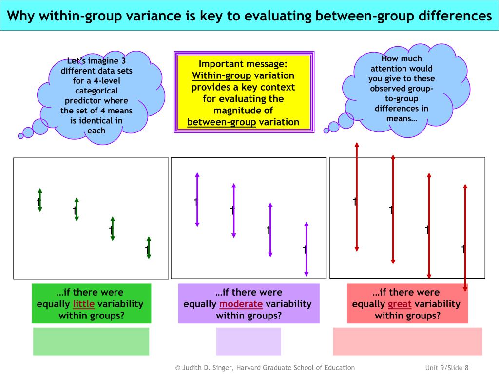 Why within-group variance is key to evaluating between-group differences † † † † † † † † † † † † How much attention would you give to these observed group-to-group differences in means… Let’s imagine 3 different data sets for a 4-level categorical predictor where the set of 4 means is identical in each Important message: Within-group variation provides a key context for evaluating the magnitude of between-group variation …if there were equally little variability within groups? …if there were equally moderate variability within groups? …if there were equally great variability within groups?