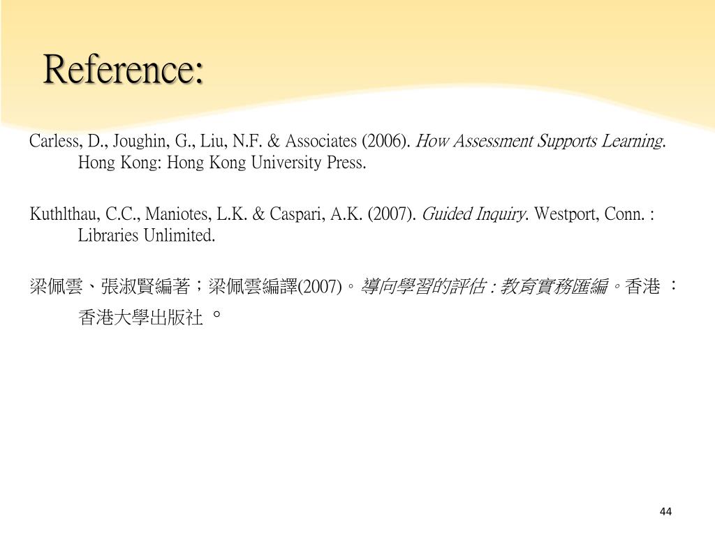 Reference: Carless, D., Joughin, G., Liu, N.F. & Associates (2006). How Assessment Supports Learning. Hong Kong: Hong Kong University Press. Kuthlthau, C.C., Maniotes, L.K. & Caspari, A.K. (2007). Guided Inquiry. Westport, Conn. : Libraries Unlimited. 梁佩雲、張淑賢編著;梁佩雲編譯(2007)。導向學習的評估 : 教育實務匯編。香港 :香港大學出版社。