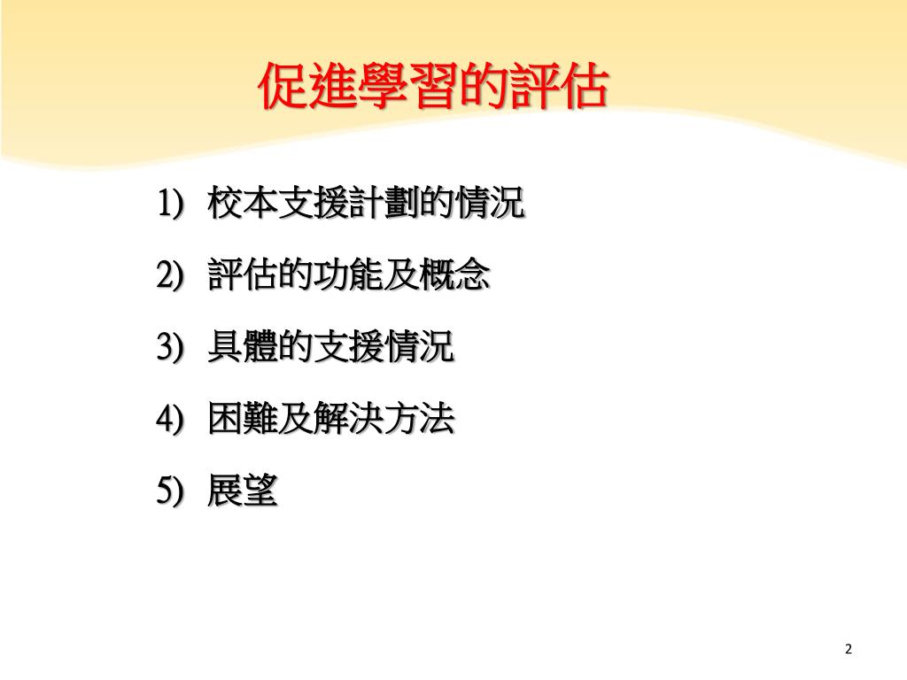 促進學習的評估 • 校本支援計劃的情況 • 評估的功能及概念 • 具體的支援情況 • 困難及解決方法 • 展望