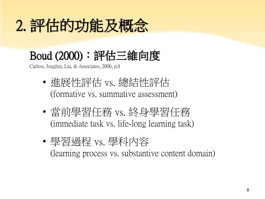 2. 評估的功能及概念 Boud (2000):評估三維向度 Carless, Joughin, Liu, & Associates, 2006, p.8 • 進展性評估 vs. 總結性評估(formative vs. summative assessment) • 當前學習任務 vs. 終身學習任務(immediate task vs. life-long learning task) • 學習過程 vs. 學科內容(learning process vs. substantive content domain)
