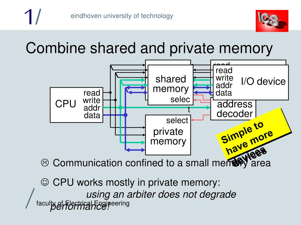read read write write sharedmemory sharedmemory I/O device I/O device addr addr data data read select select write CPU addressdecoder addr data select privatememory Combine shared and private memory • Communication confined to a small memory area • CPU works mostly in private memory:using an arbiter does not degrade performance! Simple to have more devices