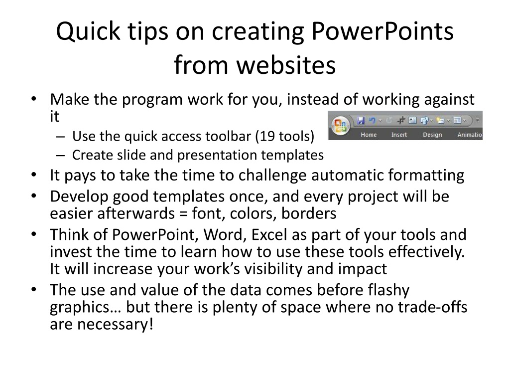 Quick tips on creating PowerPoints from websites • Make the program work for you, instead of working against it • Use the quick access toolbar (19 tools) • Create slide and presentation templates • It pays to take the time to challenge automatic formatting • Develop good templates once, and every project will be easier afterwards = font, colors, borders • Think of PowerPoint, Word, Excel as part of your tools and invest the time to learn how to use these tools effectively. It will increase your work’s visibility and impact • The use and value of the data comes before flashy graphics… but there is plenty of space where no trade-offs are necessary!