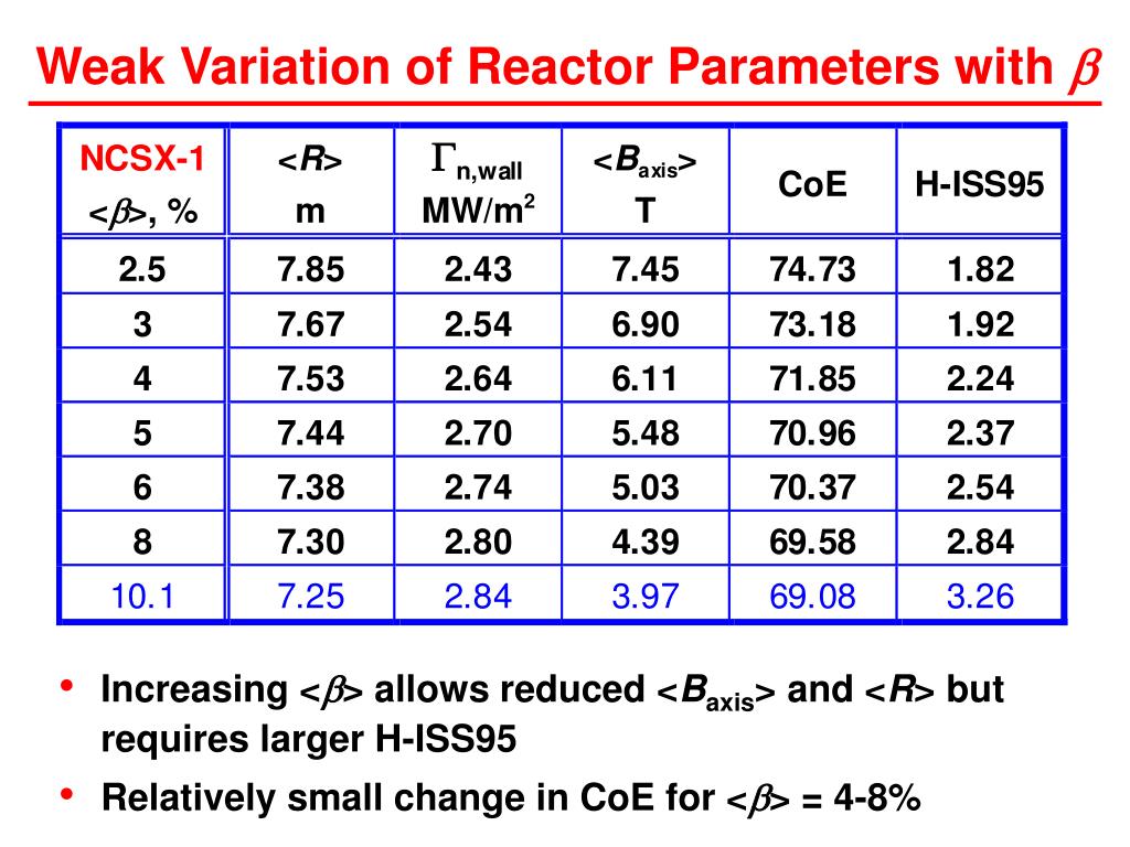 Weak Variation of Reactor Parameters with b • Increasing <b> allows reduced <Baxis> and <R> but requires larger H-ISS95 • Relatively small change in CoE for <b> = 4-8%