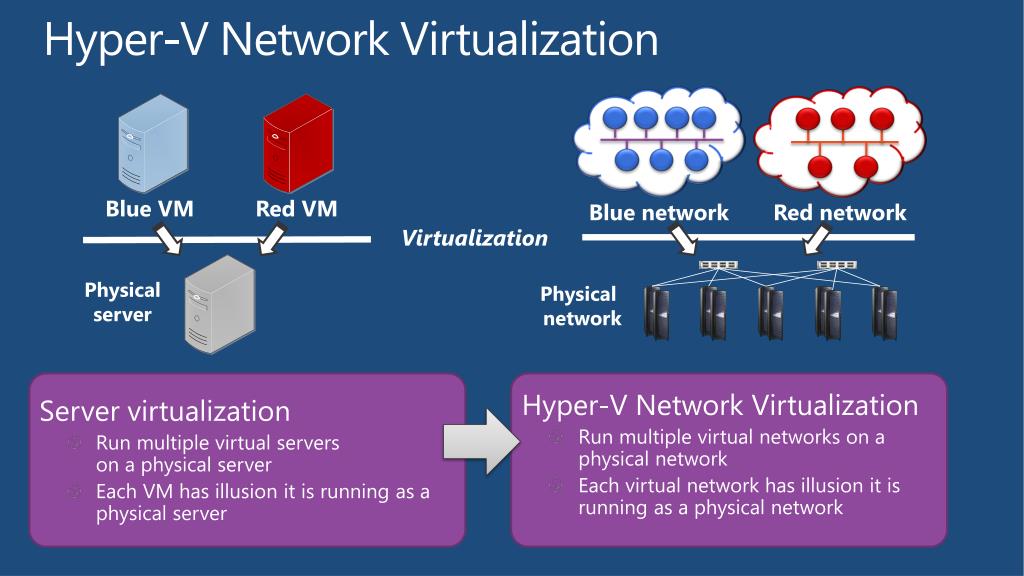 Hyper-V Network Virtualization Server virtualization • Run multiple virtual serverson a physical server • Each VM has illusion it is running as a physical server Hyper-V Network Virtualization • Run multiple virtual networks on a physical network • Each virtual network has illusion it is running as a physical network Blue VM Red VM Blue network Red network Virtualization Physical server Physical network