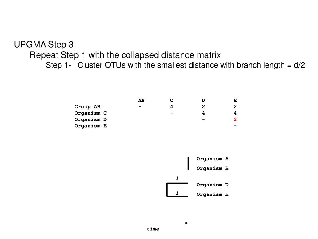 UPGMA Step 1- Cluster the Operational Taxonomic UnitsOTUs with the smallest distance with branch length = d/2 A B C D E Organism A - 0 4 2 2 Organism B - 4 2 2 Organism C - 4 4 Organism D - 2 Organism E - Organism A Organism B time