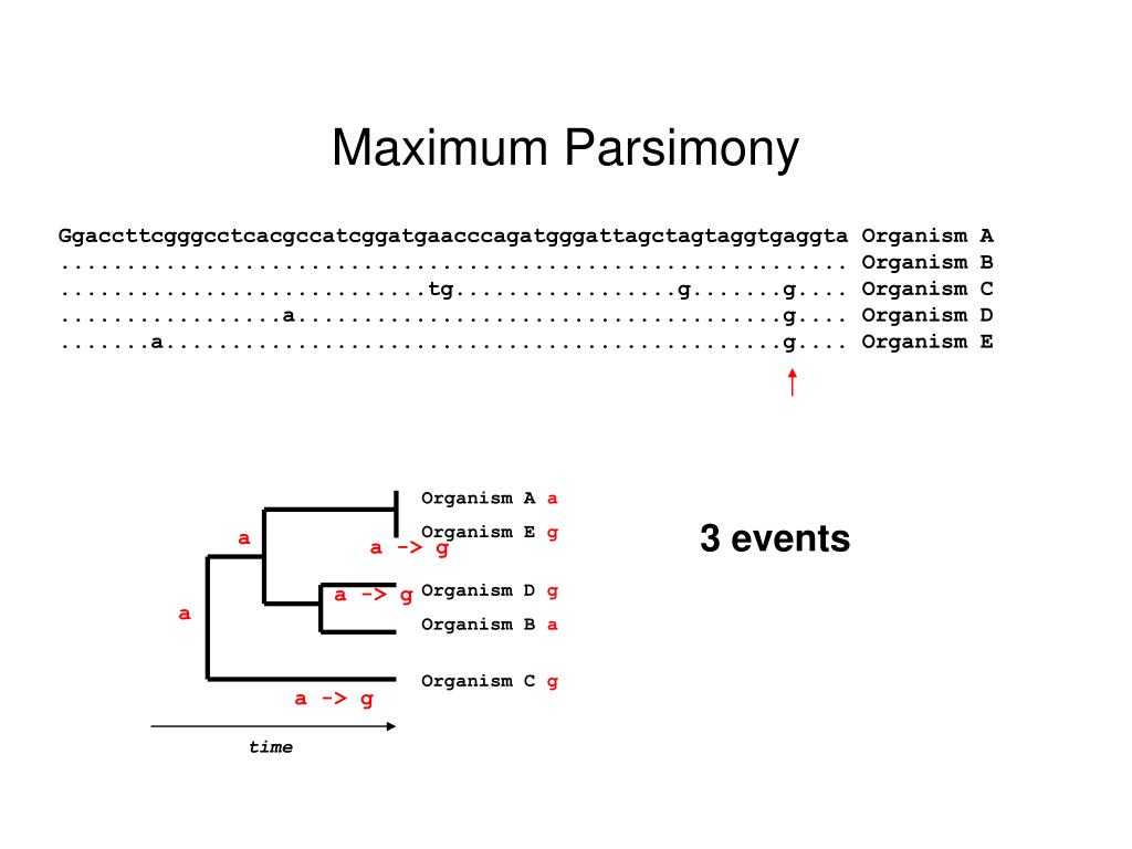 Maximum Parsimony Ggaccttcgggcctcacgccatcggatgaacccagatgggattagctagtaggtgaggta Organism A ............................................................ Organism B ............................tg.................g.......g.... Organism C .................a.....................................g.... Organism D .......a...............................................g.... Organism E g -> a Organism A a Organism B a 1 event g g Organism D g Organism E g g Organism C g time