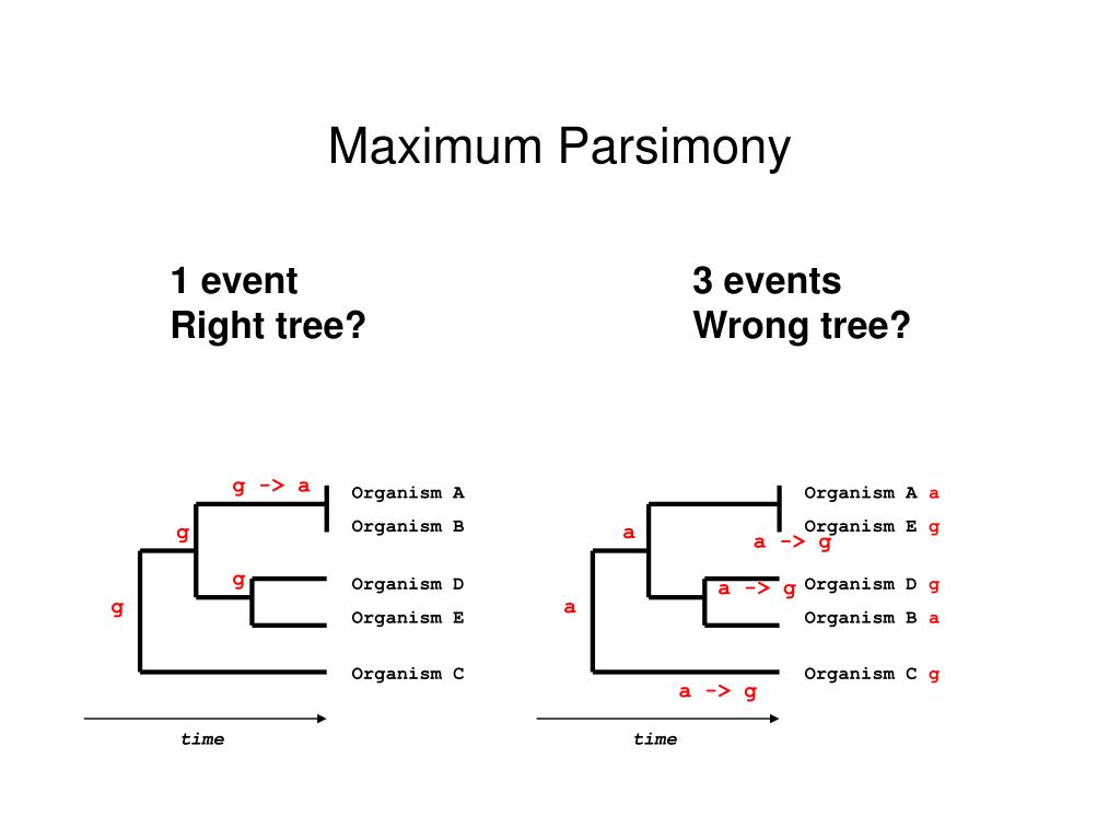 Maximum Parsimony 1 event Right tree? 3 events Wrong tree? g -> a Organism A Organism B Organism A a Organism E g g a a -> g g Organism D Organism E Organism D g Organism B a a -> g g a Organism C Organism C g a -> g time time
