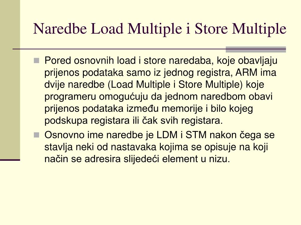 Naredbe Load Multiple i Store Multiple • Pored osnovnih load i store naredaba, koje obavljaju prijenos podataka samo iz jednog registra, ARM ima dvije naredbe (Load Multiple i Store Multiple) koje programeru omogućuju da jednom naredbom obavi prijenos podataka između memorije i bilo kojeg podskupa registara ili čak svih registara. • Osnovno ime naredbe je LDM i STM nakon čega se stavlja neki od nastavaka kojima se opisuje na koji način se adresira slijedeći element u nizu.