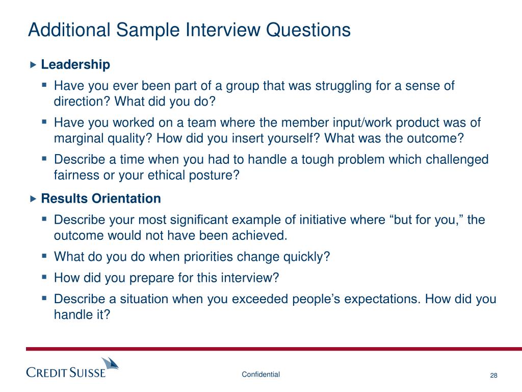 Additional Sample Interview Questions • Leadership • Have you ever been part of a group that was struggling for a sense of direction? What did you do? • Have you worked on a team where the member input/work product was of marginal quality? How did you insert yourself? What was the outcome? • Describe a time when you had to handle a tough problem which challenged fairness or your ethical posture? • Results Orientation • Describe your most significant example of initiative where “but for you,” the outcome would not have been achieved. • What do you do when priorities change quickly? • How did you prepare for this interview? • Describe a situation when you exceeded people’s expectations. How did you handle it?