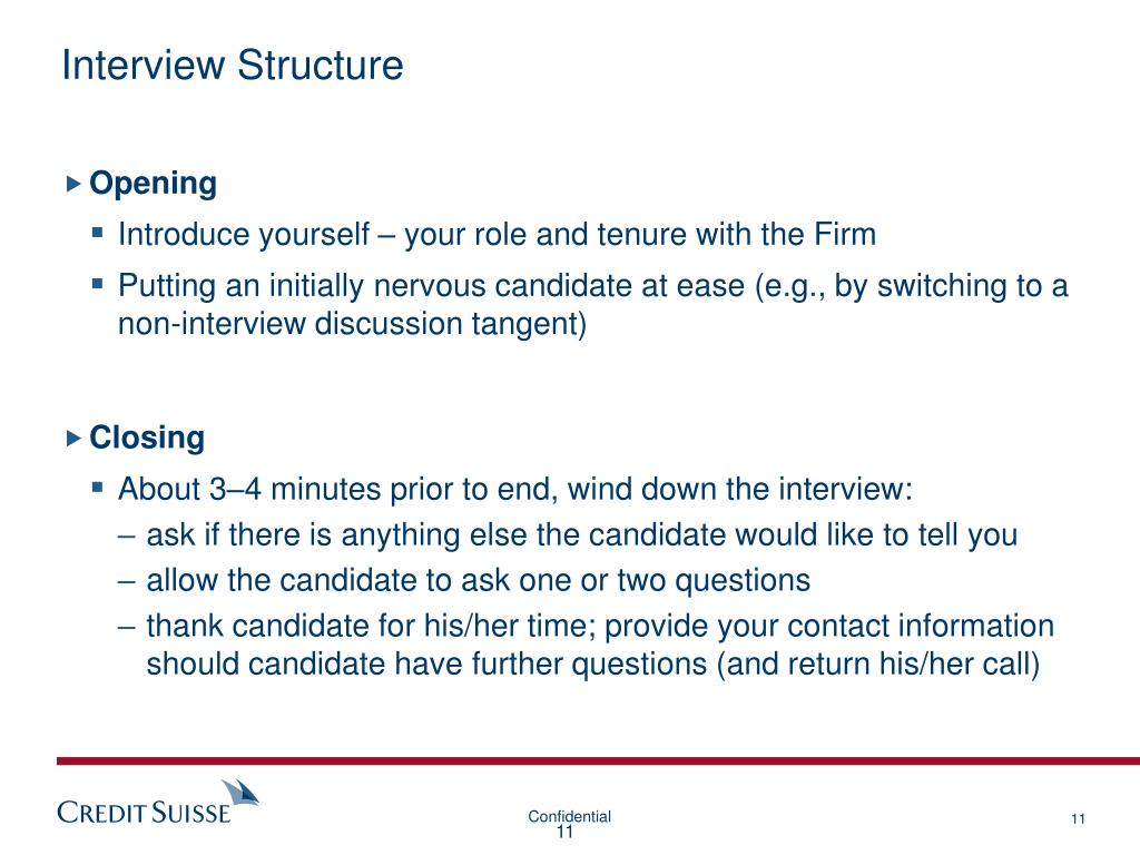 Interview Structure • Opening • Introduce yourself – your role and tenure with the Firm • Putting an initially nervous candidate at ease (e.g., by switching to a non-interview discussion tangent) • Closing • About 3–4 minutes prior to end, wind down the interview: • ask if there is anything else the candidate would like to tell you • allow the candidate to ask one or two questions • thank candidate for his/her time; provide your contact information should candidate have further questions (and return his/her call)