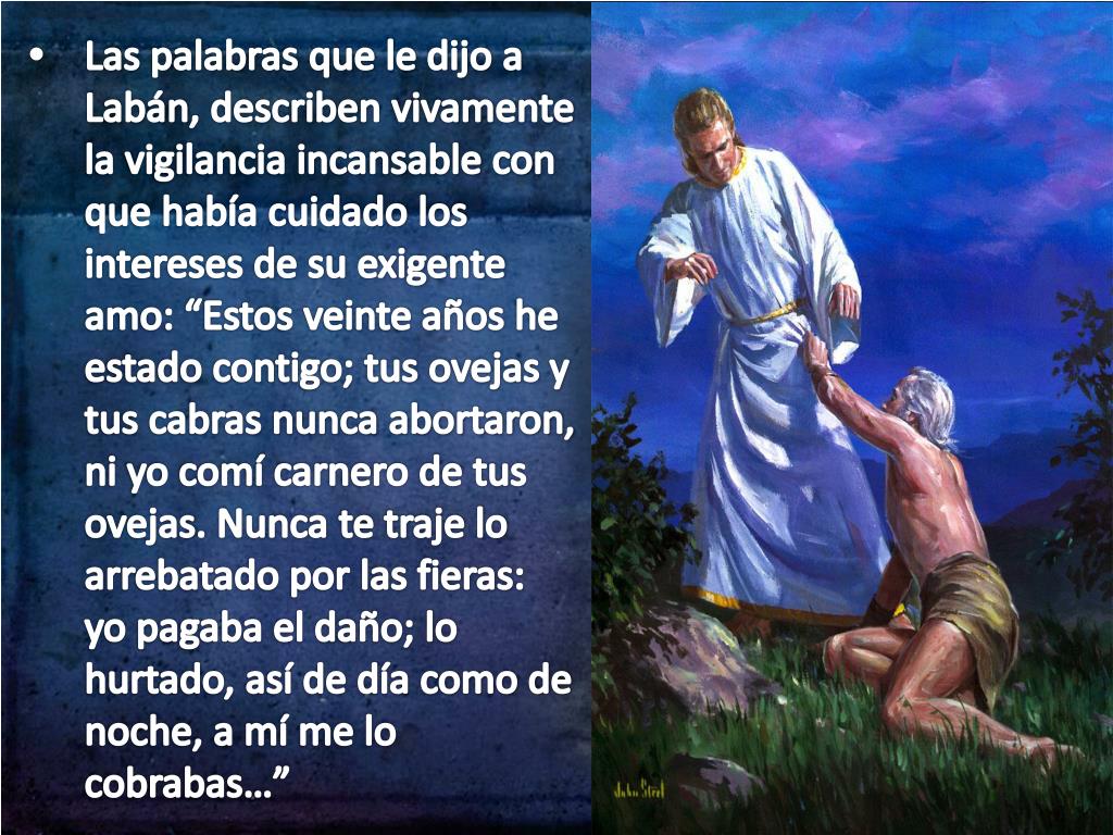 Las palabras que le dijo a Labán, describen vivamente la vigilancia incansable con que había cuidado los intereses de su exigente amo: “Estos veinte años he estado contigo; tus ovejas y tus cabras nunca abortaron, ni yo comí carnero de tus ovejas. Nunca te traje lo arrebatado por las fieras: yo pagaba el daño; lo hurtado, así de día como de noche, a mí me lo cobrabas…”