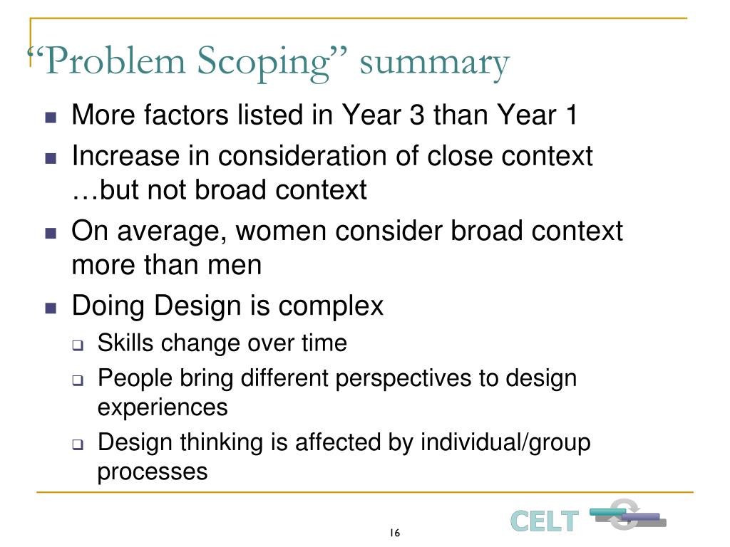 “Problem Scoping” summary • More factors listed in Year 3 than Year 1 • Increase in consideration of close context…but not broad context • On average, women consider broad context more than men • Doing Design is complex • Skills change over time • People bring different perspectives to design experiences • Design thinking is affected by individual/group processes