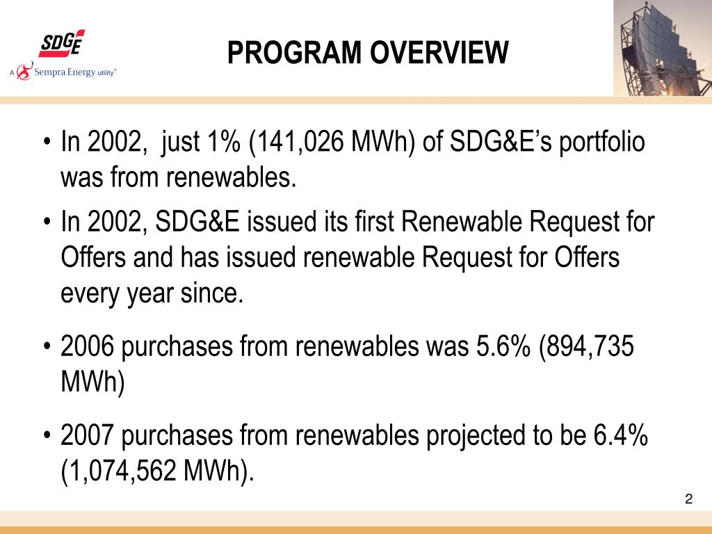 PROGRAM OVERVIEW • In 2002, just 1% (141,026 MWh) of SDG&E’s portfolio was from renewables. • In 2002, SDG&E issued its first Renewable Request for Offers and has issued renewable Request for Offers every year since. • 2006 purchases from renewables was 5.6% (894,735 MWh) • 2007 purchases from renewables projected to be 6.4% (1,074,562 MWh).