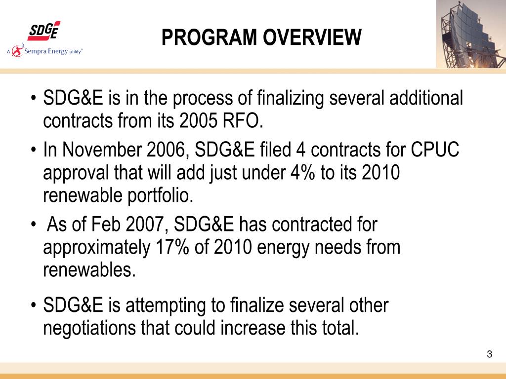PROGRAM OVERVIEW • SDG&E is in the process of finalizing several additional contracts from its 2005 RFO. • In November 2006, SDG&E filed 4 contracts for CPUC approval that will add just under 4% to its 2010 renewable portfolio. • As of Feb 2007, SDG&E has contracted for approximately 17% of 2010 energy needs from renewables. • SDG&E is attempting to finalize several other negotiations that could increase this total.
