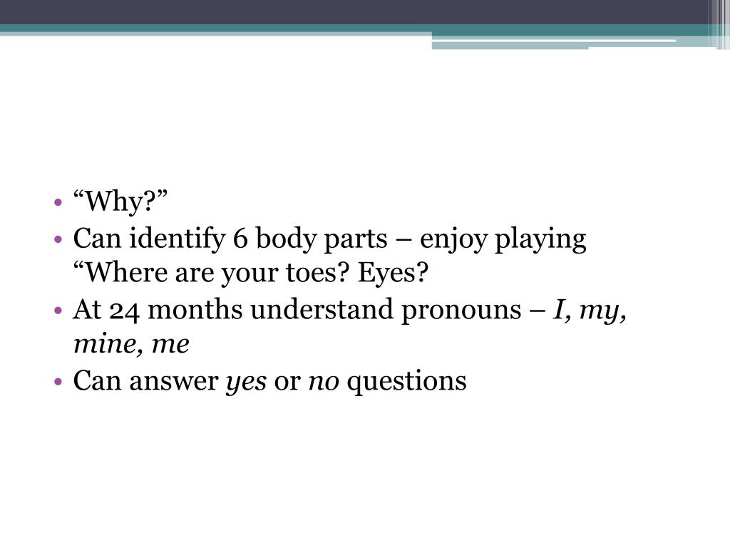 “Why?” • Can identify 6 body parts – enjoy playing “Where are your toes? Eyes? • At 24 months understand pronouns – I, my, mine, me • Can answer yes or no questions