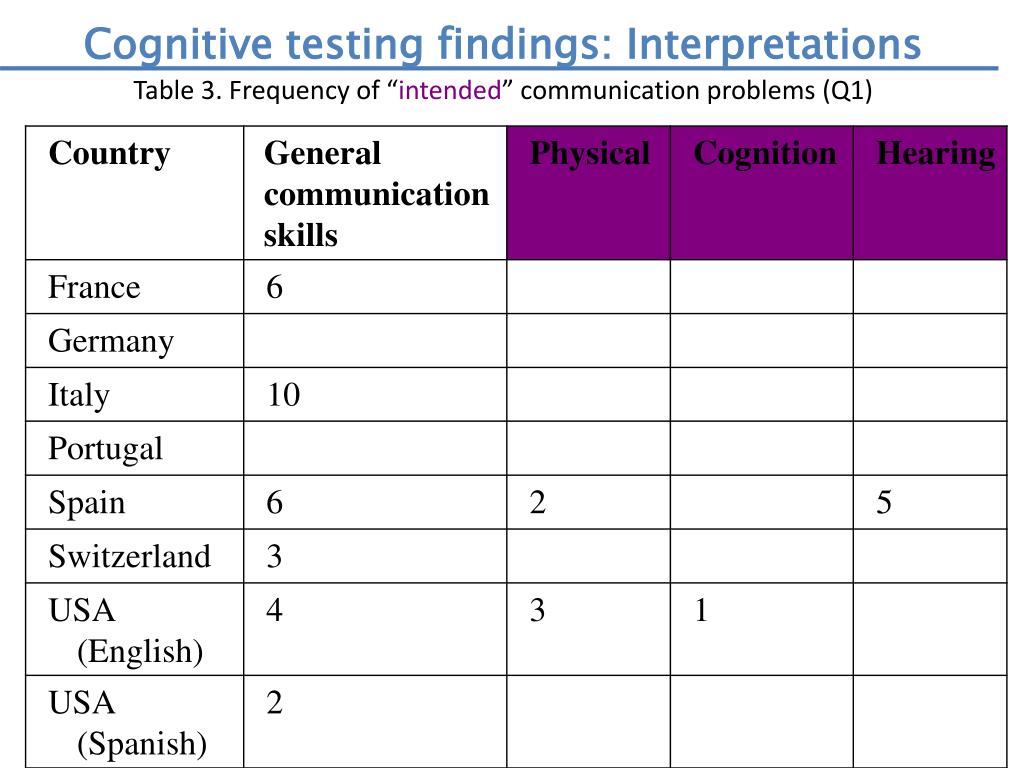 Contents • - Importance of communicationdomain • “Communication” construct • Introduction • Aims of cognitivetesting and field test • Cognitive interview findings • Field test findings • Discussion • Recomendations • Are thequestionstappingtheintended • construct? • Are theygetting at thesameconstruct? • Are therecross-country biases?