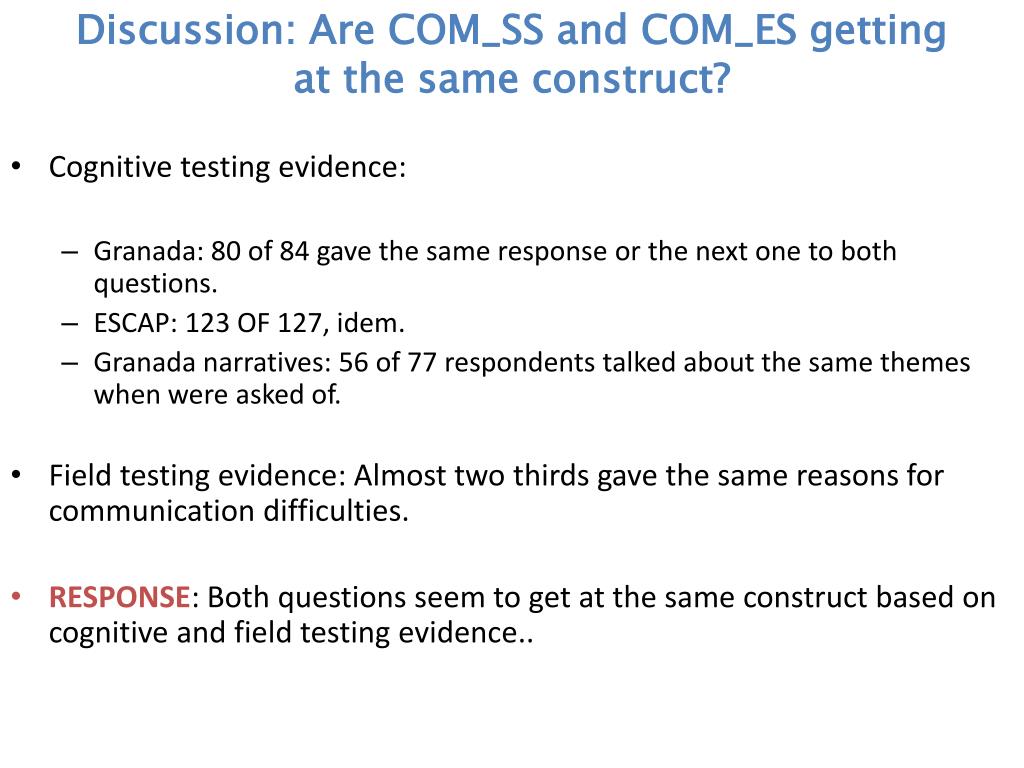 Discussion: Are COM_SS and COM_ES getting at thesameconstruct? • Cognitivetestingevidence: • Granada: 80 of 84 gavethesame response orthenextonetobothquestions. • ESCAP: 123 OF 127, idem. • Granada narratives: 56 of 77 respondentstalkedaboutthesamethemeswhenwereasked of. • Fieldtestingevidence: Almosttwothirdsgavethesamereasonsforcommunicationdifficulties. • RESPONSE: Bothquestionsseemtoget at thesameconstructbasedoncognitive and fieldtestingevidence..