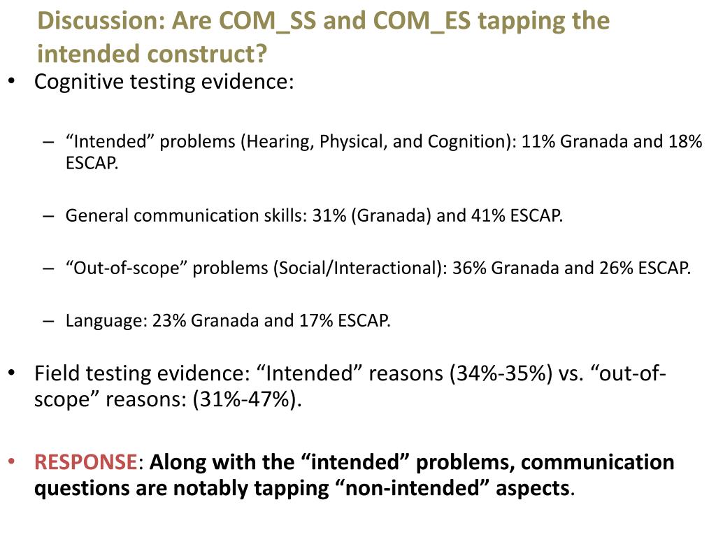 Discussion: Are COM_SS and COM_ES tappingtheintendedconstruct? • Cognitivetestingevidence: • “Intended” problems (Hearing, Physical, and Cognition): 11% Granada and 18% ESCAP. • General communicationskills: 31% (Granada) and 41% ESCAP. • “Out-of-scope” problems (Social/Interactional): 36% Granada and 26% ESCAP. • Language: 23% Granada and 17% ESCAP. • Fieldtestingevidence: “Intended” reasons (34%-35%) vs. “out-of-scope” reasons: (31%-47%). • RESPONSE: Alongwiththe “intended” problems, communicationquestions are notablytapping “non-intended” aspects.