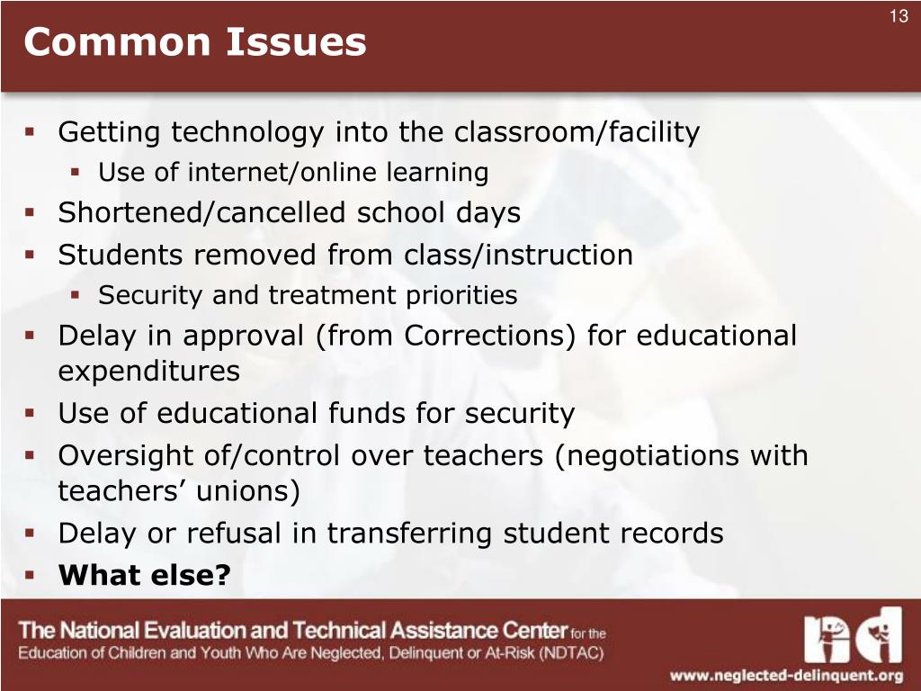 Common Issues • Getting technology into the classroom/facility • Use of internet/online learning • Shortened/cancelled school days • Students removed from class/instruction • Security and treatment priorities • Delay in approval (from Corrections) for educational expenditures • Use of educational funds for security • Oversight of/control over teachers (negotiations with teachers’ unions) • Delay or refusal in transferring student records • What else?