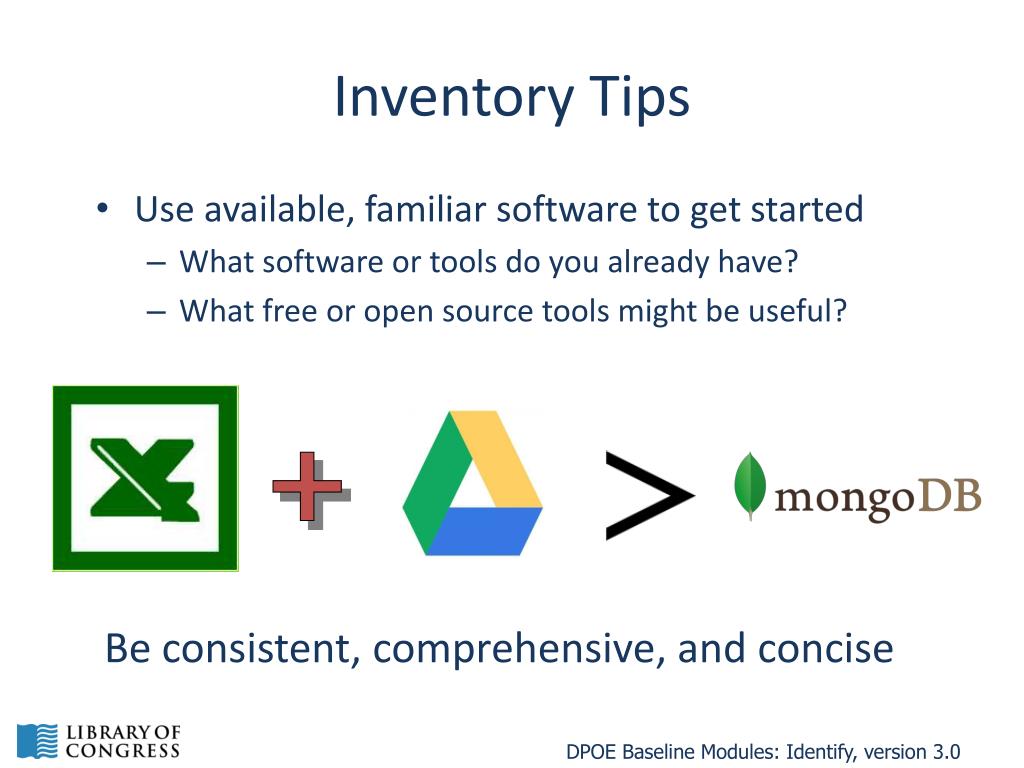 Inventory Tips Be consistent, comprehensive, and concise • Use available, familiar software to get started • What software or tools do you already have? • What free or open source tools might be useful? DPOE Baseline Modules: Identify, version 3.0