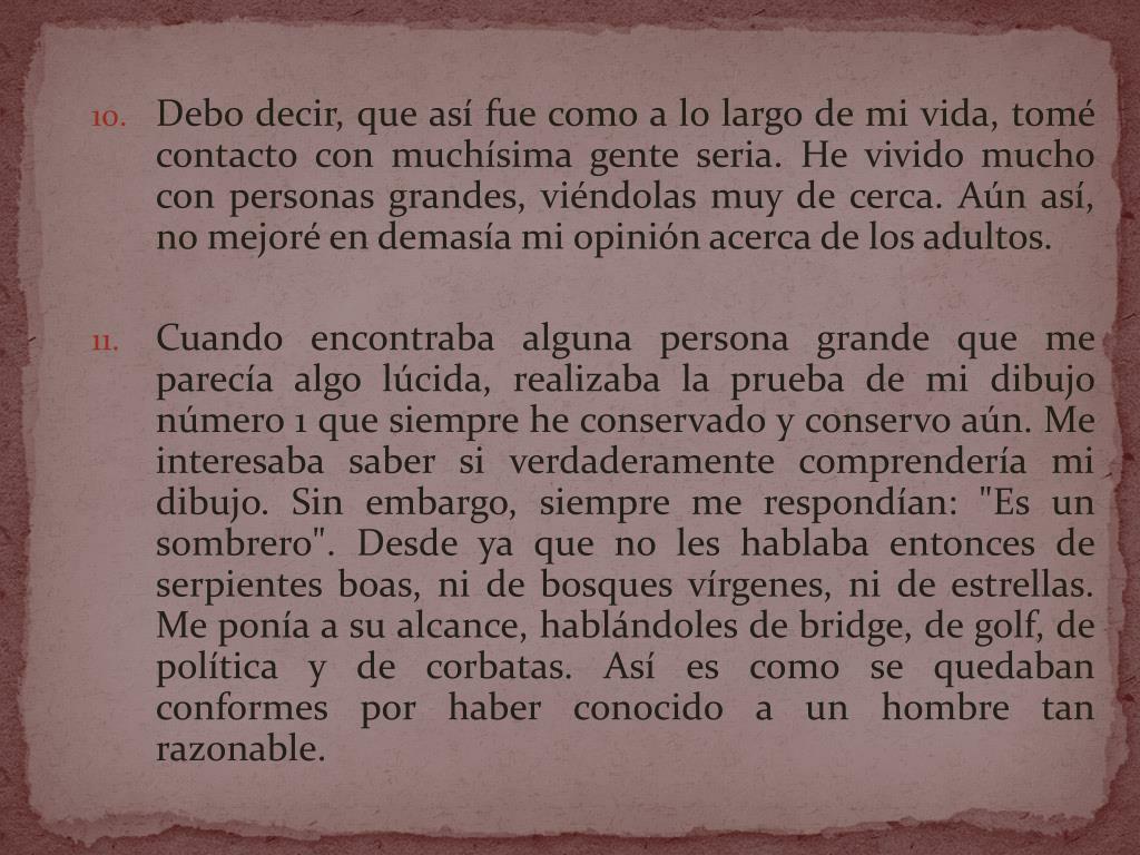 Debo decir, que así fue como a lo largo de mi vida, tomé contacto con muchísima gente seria. He vivido mucho con personas grandes, viéndolas muy de cerca. Aún así, no mejoré en demasía mi opinión acerca de los adultos. • Cuando encontraba alguna persona grande que me parecía algo lúcida, realizaba la prueba de mi dibujo número 1 que siempre he conservado y conservo aún. Me interesaba saber si verdaderamente comprendería mi dibujo. Sin embargo, siempre me respondían: "Es un sombrero". Desde ya que no les hablaba entonces de serpientes boas, ni de bosques vírgenes, ni de estrellas. Me ponía a su alcance, hablándoles de bridge, de golf, de política y de corbatas. Así es como se quedaban conformes por haber conocido a un hombre tan razonable.