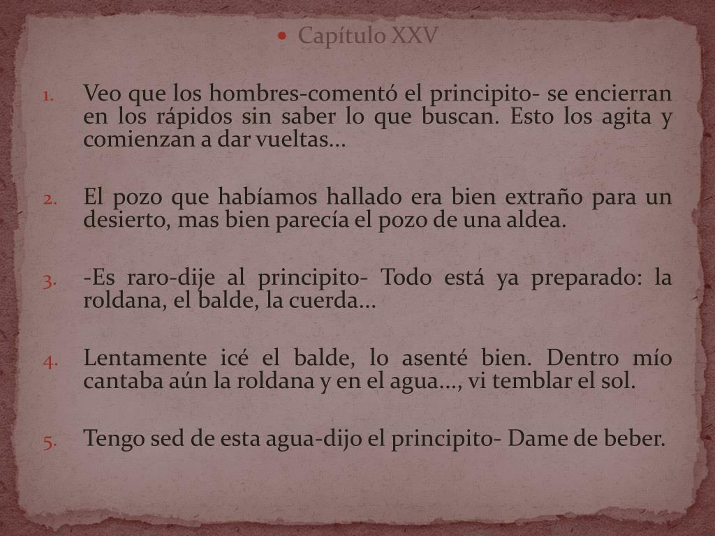 Capítulo XXV • Veo que los hombres-comentó el principito- se encierran en los rápidos sin saber lo que buscan. Esto los agita y comienzan a dar vueltas... • El pozo que habíamos hallado era bien extraño para un desierto, mas bien parecía el pozo de una aldea. • -Es raro-dije al principito- Todo está ya preparado: la roldana, el balde, la cuerda... • Lentamente icé el balde, lo asenté bien. Dentro mío cantaba aún la roldana y en el agua..., vi temblar el sol. • Tengo sed de esta agua-dijo el principito- Dame de beber.