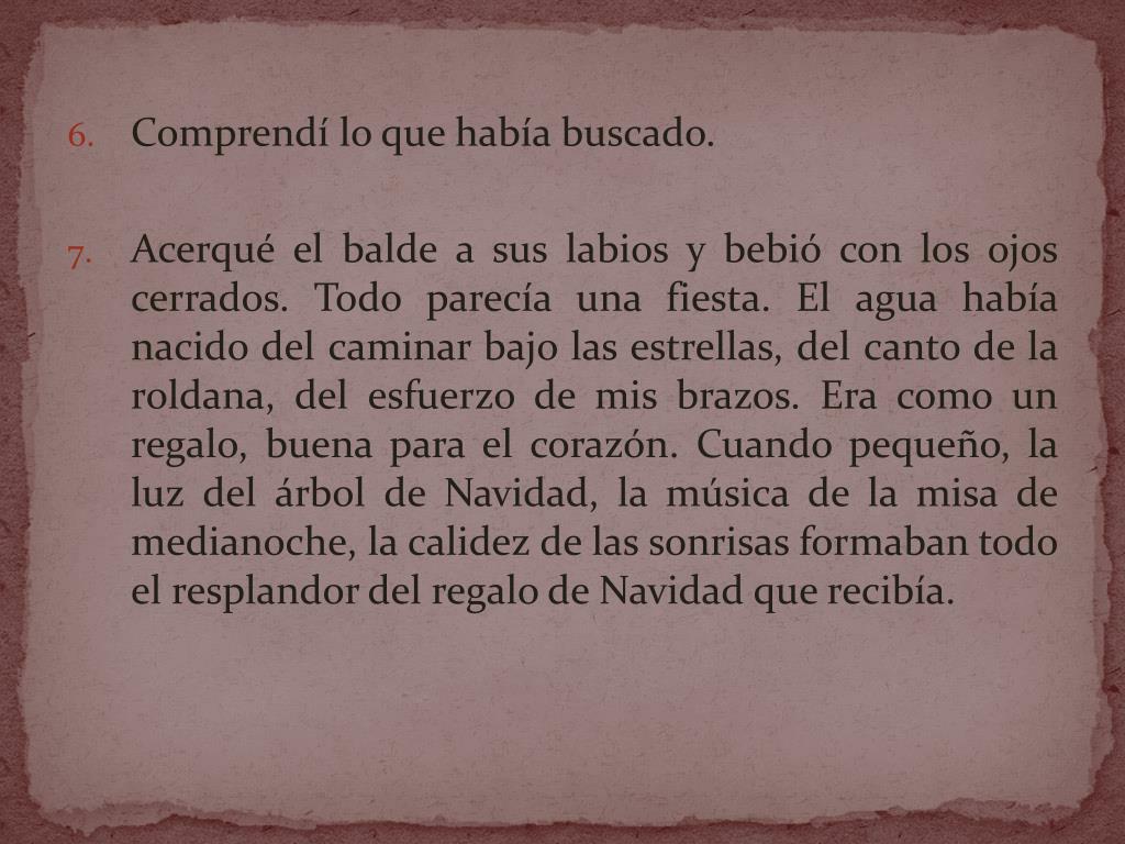 Comprendí lo que había buscado. • Acerqué el balde a sus labios y bebió con los ojos cerrados. Todo parecía una fiesta. El agua había nacido del caminar bajo las estrellas, del canto de la roldana, del esfuerzo de mis brazos. Era como un regalo, buena para el corazón. Cuando pequeño, la luz del árbol de Navidad, la música de la misa de medianoche, la calidez de las sonrisas formaban todo el resplandor del regalo de Navidad que recibía.