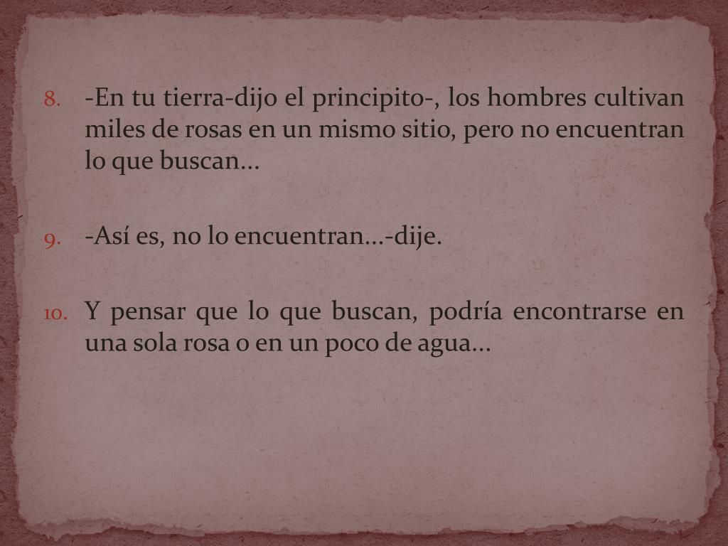 -En tu tierra-dijo el principito-, los hombres cultivan miles de rosas en un mismo sitio, pero no encuentran lo que buscan... • -Así es, no lo encuentran...-dije. • Y pensar que lo que buscan, podría encontrarse en una sola rosa o en un poco de agua...