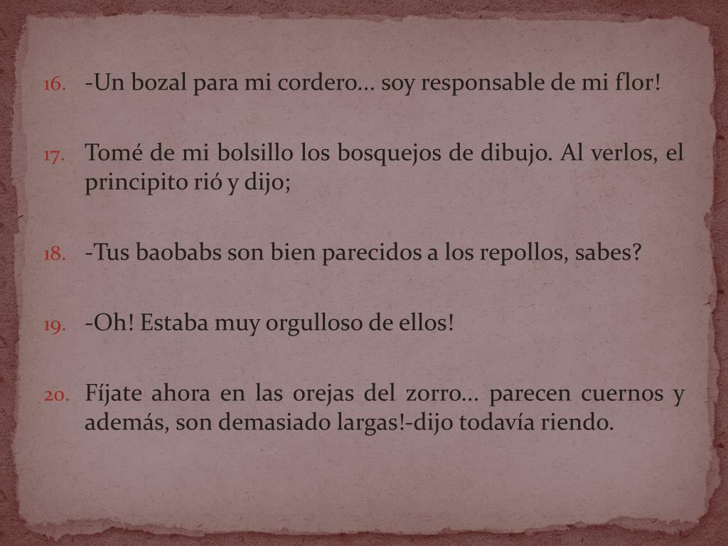 -Un bozal para mi cordero... soy responsable de mi flor! • Tomé de mi bolsillo los bosquejos de dibujo. Al verlos, el principito rió y dijo; • -Tus baobabs son bien parecidos a los repollos, sabes? • -Oh! Estaba muy orgulloso de ellos! • Fíjate ahora en las orejas del zorro... parecen cuernos y además, son demasiado largas!-dijo todavía riendo.