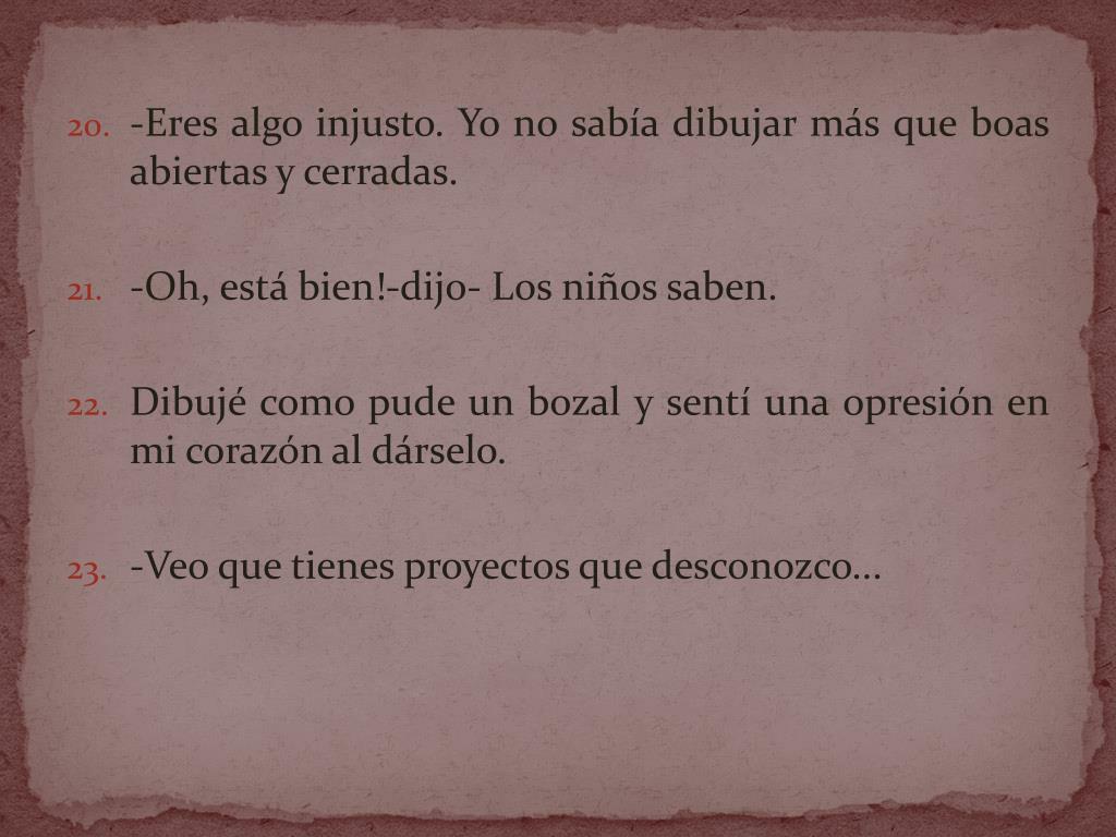 -Eres algo injusto. Yo no sabía dibujar más que boas abiertas y cerradas. • -Oh, está bien!-dijo- Los niños saben. • Dibujé como pude un bozal y sentí una opresión en mi corazón al dárselo. • -Veo que tienes proyectos que desconozco...