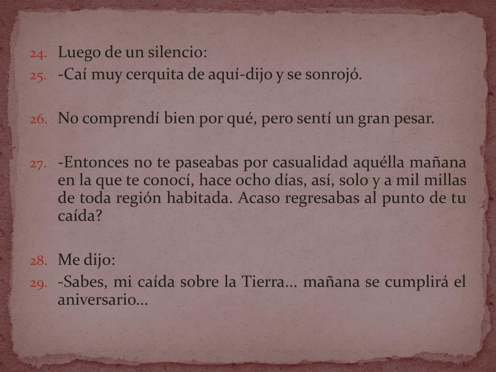 Luego de un silencio: • -Caí muy cerquita de aquí-dijo y se sonrojó. • No comprendí bien por qué, pero sentí un gran pesar. • -Entonces no te paseabas por casualidad aquélla mañana en la que te conocí, hace ocho días, así, solo y a mil millas de toda región habitada. Acaso regresabas al punto de tu caída? • Me dijo: • -Sabes, mi caída sobre la Tierra... mañana se cumplirá el aniversario...