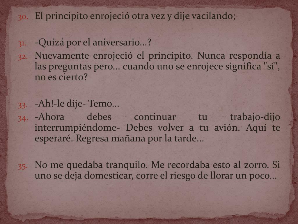 El principito enrojeció otra vez y dije vacilando; • -Quizá por el aniversario...? • Nuevamente enrojeció el principito. Nunca respondía a las preguntas pero... cuando uno se enrojece significa "sí", no es cierto? • -Ah!-le dije- Temo... • -Ahora debes continuar tu trabajo-dijo interrumpiéndome- Debes volver a tu avión. Aquí te esperaré. Regresa mañana por la tarde... • No me quedaba tranquilo. Me recordaba esto al zorro. Si uno se deja domesticar, corre el riesgo de llorar un poco...
