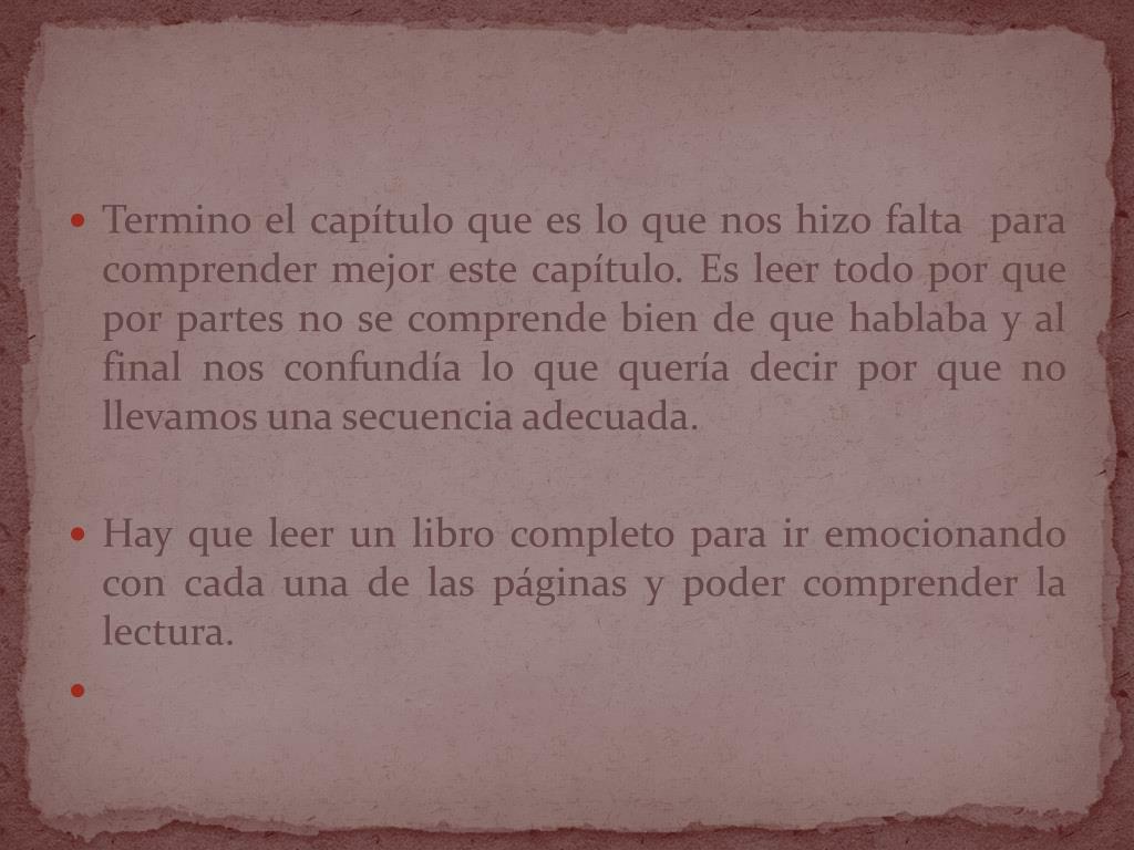 Termino el capítulo que es lo que nos hizo falta para comprender mejor este capítulo. Es leer todo por que por partes no se comprende bien de que hablaba y al final nos confundía lo que quería decir por que no llevamos una secuencia adecuada. • Hay que leer un libro completo para ir emocionando con cada una de las páginas y poder comprender la lectura.